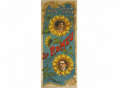 1900 ca. CARTEL. CONJUNTO DE 2 CARTELES DE LES ROMEU. DUETO CÓMICO ESPAÑOL. 2 carteles litográficos. 116 x 47 cm (45,5 x 18,5 in) aprox. Entelado, con múltiples restauraciones; B-.