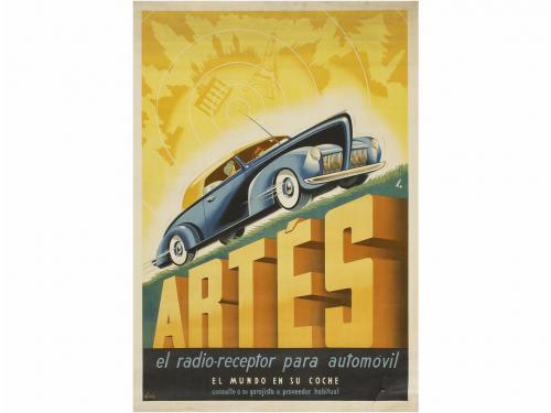 1945. CARTEL. ARTÉS. LA RADIO-RECEPTOR PARA AUTOMÓVIL. Litografía. 100 x 71 cm (39 x 28 in). Corte en el margen inferior y pequeñas señales de humedad en el corte superior. A-.