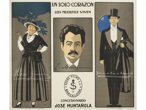 1914. CARTEL. UN SOLO CORAZON-LOS MUERTOS VIVEN. Litografía. 84 x 98 cm (33 x 38,5 in). Película de 1914 producida por Segre Films y dirigida por José de Torogues con María Guerrero y Eduardo Marquina. Entelado; A-.