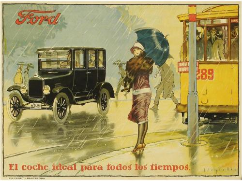1925 ca. CARTEL. FORD. EL COCHE IDEAL PARA TODOS LOS TIEMPOS. Lámina central, folleto publicitario. Litografía. 37 x 47 cm (14,5 x 18,5 in). A.