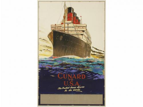 1920 ca. CARTEL. CUNARD TO U.S.A. THE FASTEST OCEAN SERVICE IN THE WORLD. Litografía. 102 x 64,5 cm (40 x 25,5 in). Anónimo. Entelado; A.