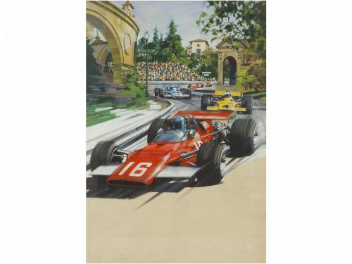 1970 ca. ORIGINAL ARTÍSTICO. ORIGINAL ARTÍSTICO DEL CARTEL XVII GRAN PREMIO DE ESPAÑA. [Acrílico]. Firma autógrafa. 85 x 65 cm (33,5 x 25,5 in). A. Enmarcado.