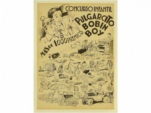 1930. CARTEL. CONCURSO INFANTIL. PULGARCITO, BOBIN, BOY. 69 x 50 cm (27 x 19,5 in). Impreso a una tinta. Entelado; A. [Más]: RECORTABLES MARIQUITA. 34 x 49 cm (13,5 x 19 in). A-. [Más]: CIMARRÓN. LA NUEVA PUBLICACIÓN. 69 x 50 cm (27 x 19,5 in). A.