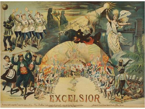 1888. CARTEL. (TEATRO DE NOVEDADES). EXCELSIOR. Litografía Busquets y Vidal. 64 x 88 cm (25 x 34,5 in). Anónimo. Antigua anotación manuscrita al pie de "D. Ignasi Elias". Entelado; A-.