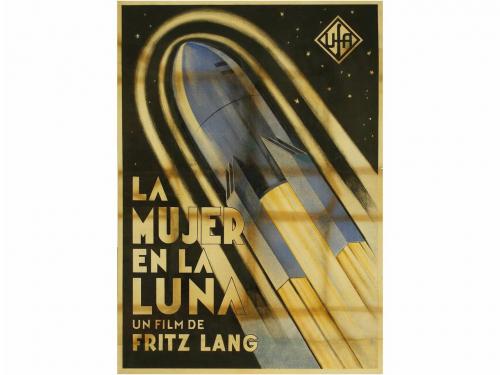 1929. CARTEL. LA MUJER EN LA LUNA. Litografía. Película de Friz Lang. 104 x 76 cm (41 x 29,5 in). Reconstruido parcialmente en un 20% de su superfície, con faltas de papel, el margen superior e inferior redibujado en su totalidad así como en pequeñas zonas, imprescindible examinar.