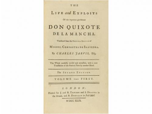 1749. LIBRO. (CERVANTINA). THE LIFE AND EXPLOITS OF THE INGENIOUS GENTLEMAN DON QUIXOTE DE LA MANCHA. Translated from the Original Spanish of (...) by Charles Jarvis. London: J. and R. Tomson and S. Draper and R. Dodsley, 1749. 2 vol. en 8º mayor. I: XXII p. + 13 h. + 406 p. 11 grabados dibujados por I. Vanderbank y grabados por G. Vander Gucht. II: 8 h. + 422 p. y 12 grabados. Los dos vol. con cabeceras, capitales y "culs-de-lamp". Edición muy bonita y cuidada. Enc. en plena piel, ruedas doradas y contracantos, nervios, lomeras cuajadas, cortes pintados, planos muy rozados. Segunda edición de la traducción de Jarvis, que enriqueció la literatura inglesa con este trabajo.