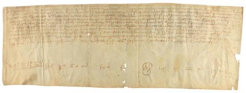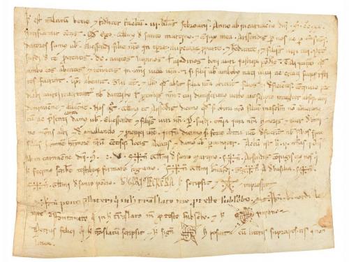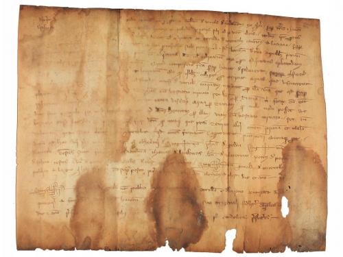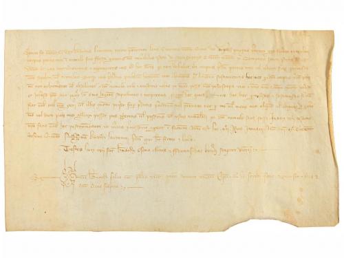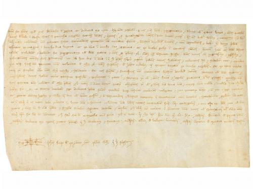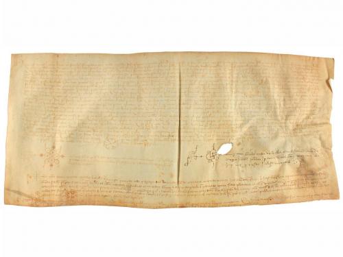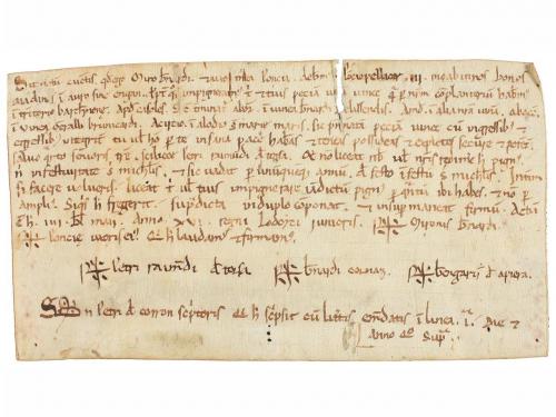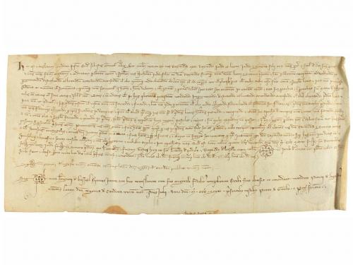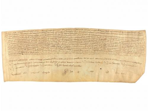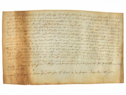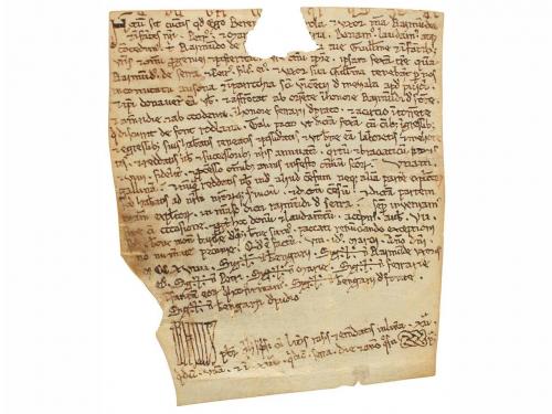 1205. MANUSCRITO. (NOGUERA). TRASLADO (1205-1220) DEL ESPONSALICIO ENTRE GUILLEM DE SANT MARTI Y SU MUJER ARSENDA A SU HIJA ELISENDA POR SU MATRIMONIO. LE CEDEN 600 MONEDAS DE ORO CON PACTO QUE EN CASO DE MORIR SU HERMANO HEREDAR. Pergamino manuscrito con signum notarial. 18 x 23,5 cm. Traslado realizado por el presbítero Ponç , del documento por el cual Guillem de Santmartí i Arsenda, esposos, dan a Elisenda, su hija, en el momento de casarse, y a los hijos que tenga con Pere Sord, como parte de su herencia, 600 auris lupins o aiadins, con la condición de ser devueltos a los padres si Elisenda muere sin hijos. Al mismo tiempo, acuerdan que si al morir Guillemi Arsenda no han tenido hijos varones Elisenda y sus hijos con Pere Sord recibiran los bienes que el matrimonio tiene en Montblanc y Maldanell. La fecha 1205 aparece raspada de manera que se lee 1105, pero Montblanc no fue fundado con ese nombre hasta 1163, por lo que la fecha debe leerse tal como indicamos.