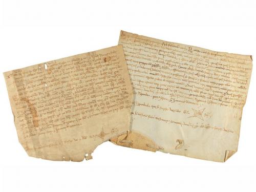 1302, 1337 y 1343. MANUSCRITO. (PERGAMINO-PALAFRUGELL). LOTE DE TRES PERGAMINOS NOTARIALES DEL S. XIV. Diferentes tamaños, el menor de ellos 13 x 27 cm y el mayor 18 x 50 cm. El fechado en 1302 es un ápoca de pago de 300 sous en moneda barcelonesa en la parroquia de San Martí de la Mota. El de 1337 es una cabrevación de una masovería de varias piezas de tierra; el de 1343 es un establecimiento perpetuo en enfiteusis de unas tierras en Palafrugell. Los dos primeros firmados ante notario en Girona el tercero en Torroella de Montgrí.