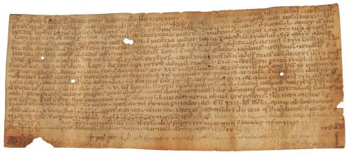 1072. MANUSCRITO. (NOGUERA- COSCÓ). TESTAMENTO DE BERNAT GUIRARD A FAVOR DE LA OBRA DE SANTA MARIA DE COSCO (NOGUERA), A SU MUJER VIERNA Y A SUS HIJOS GUILLEM, RAMON Y AUFRED, A LOS QUE LEGA EL ALODIO EN COSCO. Manuscrito sobre pergamino. 16 x 42 cm. Testamento de Bernat Girard (o Guirau). Escoge como albaceas a su esposa Vierna y sus hijos Guillem, Ramon y Guifré Bonfill. Dispone de la mitad de sus bienes y la otra mitad queda en manos de su esposa Vierna. Hace un legado a Santa María de Coscó de 15 mancusos. Sus bienes serán para sus hijos, Guillem, Ramon y Arnau, que los conservarán si tuvieren hijos. Declara poseer bienes en los términos de Oliola y Coscó. Una de las referencias más tempranas a Santa Maria del Coscó, la más antigua documentada data del año 1054 y esta a penas 18 años después.