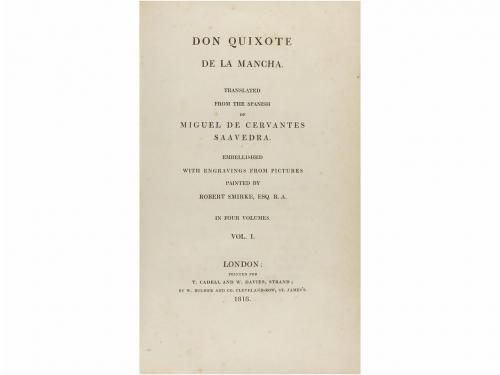 1818. LIBRO. (CERVANTINA). DON QUIXOTE DE LA MANCHA. Translated from the spanish of ... Embellished with engravings from pictures painted by Robert Smirke, esq. R. A. In four volumes. London: T. Cadell and W. Davies, Strand; by W. Bulmer and Co., 1818. 4 vol. en 4º menor. I: 2 h. + 2 p. + LXXXIV + 409 p. + 12 lám. II: 4 h. + 395 p. + 11 lám. III: 4 h. + XIII + 432 p. + 13 lám. IV: 2 h. + IV + 508 p. + 12 lám. Profus. ilustr. con un total de 48 lám., bellas viñetas y culs-de-lampe grabadas por A. Raimbach, Englenheart, Golding, Smith, etc. y dibujadas por R. Smirke. Amplios márgenes, lám. tostadas, algún punto de óxido. Enc. de Riviere and son en tafilete rojo, lomera cuajada, nervios, ambos planos con dorados y hierros secos, cantos y cejas, corte superior dorado; puntas y cantos ligeramente rozados. Exlibris de anterior poseedor. Palau 52519: "Buena y lujosa edición... hay ejemplares con 24 lám., otros con 50, pero en rigor son 74. Las ilustraciones de Smirke tienen mérito artístico, pero son más inglesas que españolas". CCPB 524647-4. Bardon, 2016 p. 104.