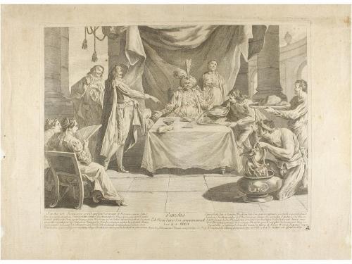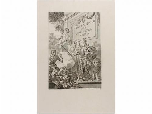 1753 ca. GRABADO. (CERVANTINA). CONJUNTO DE 16 CALCOGRAFÍAS DEL QUIJOTE DE COYPEL. Paris: J. Chereau, 1753 ca. Papel: 41 x 50,5 cm; Huella: 30 x 38,5 cm. Lote de 16 calcografías en papel verjurado. Texto explicativo en francés y castellano dentro de la huella. Conjunto importante, aunque no completo de toda la serie formada por 25 estampas en total. Bellas reproducciones quijotescas al peculiar estilo cortesano francés que tanto caracteriza la factura de Coypel. Algún punto de óxido y cerco de humedad marginal.