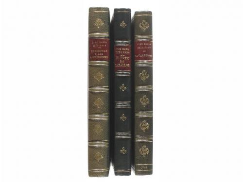 1970. LIBRO. (NAVARRA-LITERATURA). HEMINGWAY Y LOS SANFERMINES. Pamplona: Ed. Gomez, 1970. 8º mayor. 215 p. + 2 h. Ilustr. con lám. fuera del texto. [Más:] EL PATIO DE CABALLOS Y OTRAS ESTAMPAS. Zaragoza: Librería General, 1952. 8º mayor. 218 p. + 3 h. [Más:] NAVARRERÍAS. Pamplona: Imp. Bengaray, 1944. 8º mayor. 269 p. Las tres obras enc. cada una en plena piel, con nervios, tejuelo, hilos dorados en ambos planos y las tres conservan sus cubiertas y lomera originales.