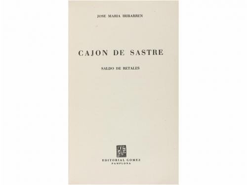 1955. LIBRO. (NAVARRA-LITERATURA). CAJON DE SASTRE, SALDO DE RETALES. Pamplona: Ed. Gomez, 1945. 218 p. + 1 h. [Más:] Id. BURLAS Y CHANZAS. Id., 1951. 8º menor. 232 p. + 1 h. [Más:] Id. EL MORO CORELLANO Y LOS BANDIDOS DE LANZ. Id., 1955. 8º mayor. 205 p. + 1 h. Cada una de las obras enc. en plena piel, nervios, tejuelos, hilos dorados en ambos planos, y todas conservan las cubiertas de rústica original. [Már:] IRIBARREN, JOSÉ MARÍA:. PASCUAS Y RAMOS. Pamplona: Ed. Gómez, 1946. 4º menor. 303 p. + 3 h. [Más:] ID. HISTORIAS Y COSTUMBRES. Pamplona: Imp. Excma. Diputación Foral de Navarra, 1949. 4º menor. 351 p. Las dos obras enc. cada una en plena piel reciente, con nervios, tejuelo, hilos dorados, ambas conservan también las cubiertas de rústica original.