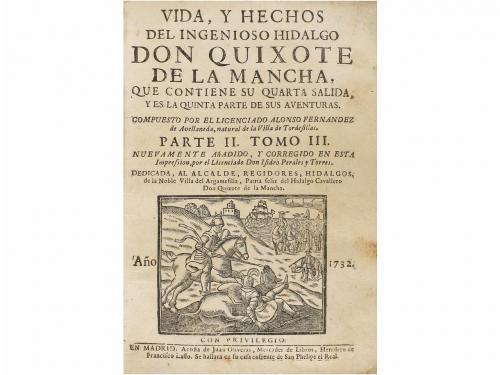 1732. LIBRO. (CERVANTINA). VIDA, Y HECHOS DEL INGENIOSO HIDALGO DON QUIXOTE DE LA MANCHA, QUE CONTIENE SU QUARTA SALIDA, Y ES LA QUINTA PARTE DE SUS AVENTURAS. Madrid: Juan Oliveras, 1732. 8º mayor. 16 h. + 275 p. +2 h. La última página numerada 475 por error. Grabado en la portada. Cabeceras y culs-de-lampe xilografiadas. Algo corto de márgenes. Enc. en pergamino, lomera rotulada. Palau 88034 dice de esta edición que es tan rara como la primera y lamenta que la ignorancia de algunos ha mutilado muchos ejemplares, pues la portada reza "Parte II. Tomo III". Es obra completa, Cervantes no publicó la verdadera segunda parte de las aventuras del Quijote hasta 1615 y el de Fernández de Avellaneda había salido de la impenta el año anterior. No se sabe a quién esconde este pseudónimo aunque hay muchas teorías. Algunos estudiosos apuntan a Cristóbal Suárez de Figueroa, por sus disputas con Cervantes y el estilo.