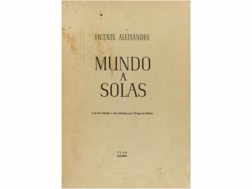 1950. LIBRO. (LITERATURA-GENERACIÓN 27). MUNDO A SOLAS 1934-1936. Con un retrato y seis dibujos por Gregorio Prieto. Madrid: Clan, 1950. Folio. 98 p. + 3 h. Portada a dos tintas. Ilustr. con un retrato y 6 lám. litografiadas en el texto. Cubierta anterior con pequeñas restauraciones en el margen interior y alguna señal de óxido. Enc. en media piel y puntas con papel al agua, lomera con dorados y nervios. Conserva las cubiertas originales. PRIMERA EDICIÓN. Tiraje de 200 en papel de hilo guarro, ejemplar núm. 148.