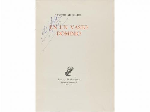 1953-1980. LIBRO. (GENERACIÓN 27-CONJUNTO). NACIMIENTO ÚLTIMO. Madrid: Ínsula, 1953. 8º mayor. 119 + 2 h. Sello de anterior poseedor. [Más:] NOVO VILLAVERDE, YOLANDA: VICENTE ALEIXANDRE. Poeta Surrealista. Burgos: Imp. de Aldecoa, 1980. 183 p. [Más:] GUILLÉN, JORGE. MAREMAGNUM. Buenas Aires: Ed. Sudamericana, 1957. Id. 197 p. + 3 h. [Más.] SEGÚN LAS HORAS. Puerto Rico: Ed. Universitaria, 1962. Id. 49 p. + 1 h. Tiraje limitado. Diversas enc. [Más:] ALEIXANDRE, VICENTE:. EN UN VASTO DOMINIO. Madrid: Revista de Occidente, 1962. 4º menor. 250 p. + 3 h. Enc. en plena piel marrón con hierros en el plano anterior, guardas pintadas al agua. Conserva las cubiertas originales. Firma manuscrita de anterior poseedor. PRIMERAS EDICIONES.