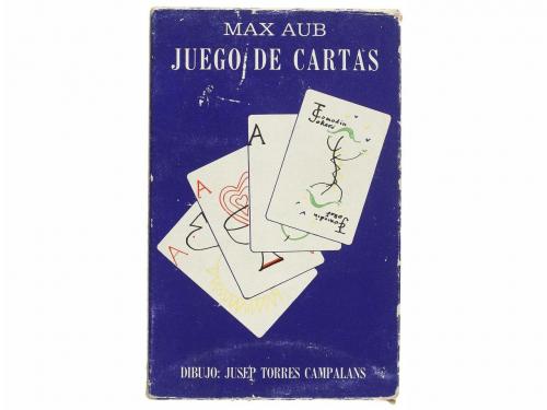 [1964]. LIBRO. (LITERATURA-SURREALISMO). JUEGO DE CARTAS. México: Alejandro Finisterre, s.a. 17,5 x 11 cm. Juego completo de 2 barajas de 106 naipes. Recto de la carta ilustr. por Josep Torres Campalans, pintor ficticio creado por el mismo Max Aub; en el verso el texto. Conserva estuche original en cartoné ligeramente rozado, presentado en una caja en plena piel, nervios. Este divertido juego de cartas fue concebido como un libro epistolar para enviar a los amigos de la familia para Navidad. Redactado e ilustrado por Max Aub (y posiblemente sus hijos), constituye uno de los más interesantes ejemplos de literatura combinatoria. Muy raro en comercio.