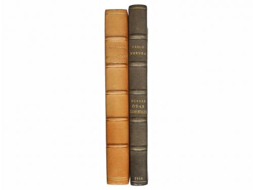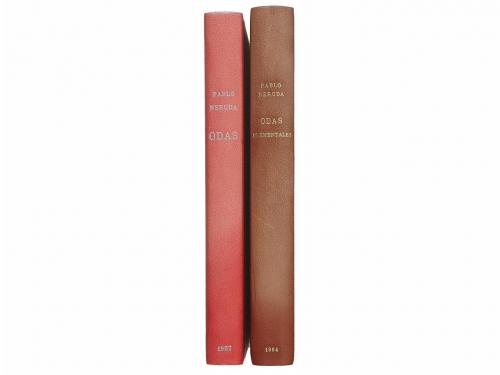 1954-1957. LIBRO. (VANGUARDIAS-CONJUNTO). ODAS ELEMENTALES. Buenos Aires: Editorial Losada, Colección Poetas de España y América, 1954. 4º mayor. Retrato + 235 p. + 1 h. [Más:] TERCER LIBRO DE LAS ODAS. Id.: Id., 1957. 205 p. + 1 h. Cubiertas ilustr. con litografía de Baldessari. Ambos enc. en media piel y puntas con papel al agua; conservan las cubiertas originales. [Más:] NUEVAS ODAS ELEMENTALES. Buenos Aires: Ed. Losada, 1955. 4º. 184 p. + 1 h. [Más:] ESTRAVAGARIO. Id, 1958. 4º . 338 p. + 3 h. 2 vol. enc., uno en media piel con guardas de papel al agua hecho a mano y otro en plena piel con hilos dorados en ambos planos y nervios; conservan las cubiertas originales. Las 4 obras que presentamos son PRIMERAS EDICIONES. Pequeñas anotaciones de anterior poseedor en las guardas.
