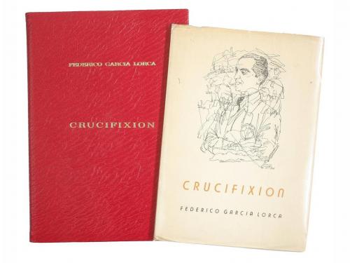 1950. LIBRO. (LITERATURA-GENERACIÓN 27). CRUCIFIXION. Notas de Miguel Benítez Inglott. Notas bibliográficas de Aurina Rodríguez. Seguidillas de José Millares Sall. Las Palmas: Imp. Ortega, 1950. 4º mayor. 30 p. + 1 h. 1 lám. con el retrato de Lorca por M. Millares, que se repite en la cubierta anterior. Facsímil de dos cartas de Federico a D. Miguel Benítez, reclamándole el original del poema: 2 facsímiles con el original del poema CRUCIFIXION y facsímil del poema EN LA MUERTE DE JOSE CIRIA Y ESCALANTE, publicado en Poesia Española. Antología, de Gerardo Diego, sobre el que Lorca realizó unas pequeñas correcciones a lápiz. Rústica con sobrecubierta, presentado en una carpeta en plena piel. PRIMERA EDICIÓN impresa de este poema, de 500 ejemplares numerados. Fechado en 1929 en NY. Sello húmedo de anterior poseedor.