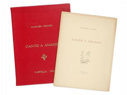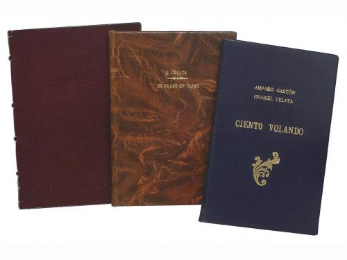 1949-1956. LIBRO. (LITERATURA-CONJUNTO). LAS COSAS COMO SON (UN DECIR). Santander: La Isla de los ratones, 1949. 8º. 46 p. Tiraje limitado y numerado de 360 ejemplares. Dedicatoria de anterior poseedor. [Más:] DE CLARO EN CLARO. Id. Madrid: Ediciones Rialp, 1956. Id. 66 p. + 7 h. [Más:] CIENTO VOLANDO. Id: Colección Nebli, 1953. 30 p. + 1 h. Dibujos de Núñez-Castelo. PRIMERAS EDICIONES. Una obra enc. en plena piel; conserva las cubiertas originales y dos en rústica original y presentadas en carpeta en plena piel.