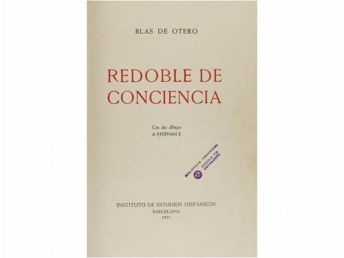 1951. LIBRO. (LITERATURA-POSGUERRA). REDOBLE DE CONCIENCIA. Con dos dibujos de Stephan E. Barcelona: Instituto de Estudios Hispánicos, 1951. 4º. 65 p. + 2 lám. + 3 h. Leves señales de óxido y pequeña restauración en las cubiertas. PRIMERA EDICIÓN. Enc. en media piel y puntas; conserva las cubiertas originales. Sello húmedo de anterior poseedor.