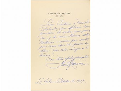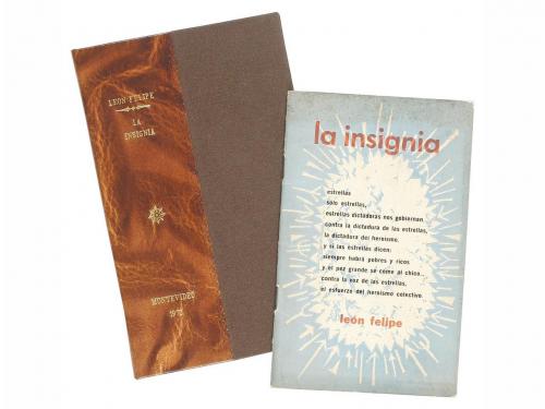 1972. LIBRO. (LITERATURA-GENERACIÓN 27). LA INSIGNIA (alocución poemática escrita a raíz de la caída de Málaga...). Montevideo: Ed. Comotú, 1972. 8º. 38 h. + 1 h. Señal de óxido en la cubierta anterior. Rústica original presentada en una carpeta en media piel y tela. Rara edición que lleva impresa en la cubierta posterior, una carta del Ché al poeta.