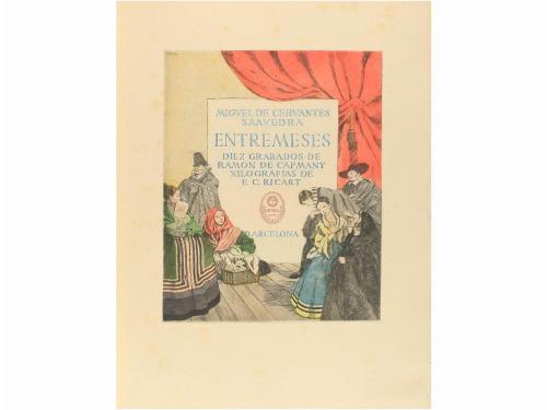 1947. LIBRO. (CERVANTINA-BIBLIOFILIA). ENTREMESES. DIEZ GRABADOS DE RAMON CAPMANY, XILOGRAFÍAS DE E. C. RICART. Sabadell: Juan Sallent, Hora, 1947. 4º mayor. 169 p. + 4 h. Impreso a dos tintas. Magníficamente decorado con xilografías de Ricart y 10 aguafuertes de Capmany. Intermitentes puntos de óxido. Bella enc. en plena piel con dorados en ambos planos, cantos y cejas, lomera cuajada, nervios, canto superior dorado, guardas de seda; leves rozaduras en el lomo. Ejemplar del tiraje de 240 sobre papel de hilo.