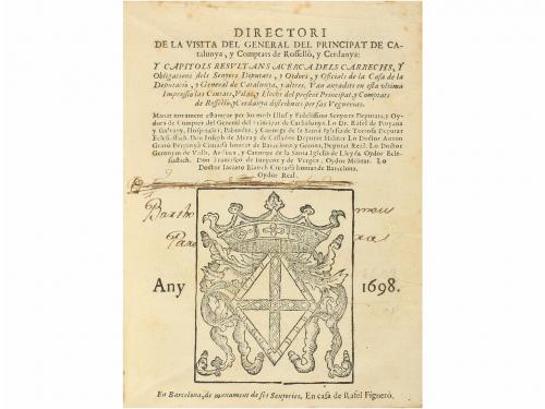 1698. LIBRO. (CATALUNYA). DIRECTORI DE LA VISITA DEL GENERAL DEL PRINCIPAT DE CATALUNYA, Y COMPTATS DE ROSSELLÓ, Y CERDANYA, Y CAPITOLS RESULTANS ACERCA DELS CARRECHS Y OBLIGACIONS DELS SENYORS DIPUTATS Y OYDORS DE LA CASA DE. Barcelona: en casa de Rafel Figueró, 1698. 8º. 320 p. Escudo xilográfico de la Diputación del General en la portada. Después de la portada empieza el texto y está paginado 5, signatura A3, pero no falta ninguna hoja porque la primera es blanca y forma pliego (suele faltar a muchos ejemplares). Puntos de óxido en los cortes y en algún margen; mínima señal de xilófago en el margen inferior derecho, no afecta texto. Edición original en base a la publicada en 1672, con el añadido nuevo que empieza en la página 241: "Nomina de las Ciutats, Vilas, y llochs del Principat de Cathalunya, y Comptats de Rosselló, y Serdanya, dividits per las Veguerias". Enc. en pergamino de época, ligeramente desprendida. Firmas de antiguos propietarios. Aguiló 1434. Palau 74121.