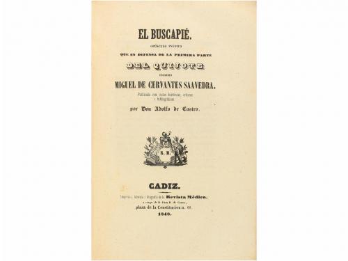 1848. LIBRO. (CERVANTINA). EL BUSCAPIÉ. Opúsculo inédito... Cadiz: Imp. de la Revista Médica, 1848. 8º. XIX + 194 p. + 1 h. Capitales. Márgenes anchos. En rústica original.