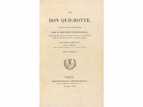1822. LIBRO. (CERVANTINA). LE DON QUICHOTTE. Trad. Bouchon Dubournial. París: Méquignon-Marvis Libr. Edit., 1822. 4 vol. en 4º menor. I: XLI + 461 p. II: 2 h. + 529 p. III: 2 h. + 570 p. IV: 2 h. + 598 p. Ilustr. con 11 lám. grabadas por Lignon, Prevost, Leroux, Caron y Burdet de dibujos de Vernet y Lamic y 1 mapa plegado: ´Carte itineraire de Don Quixotte de la Manche´ dressée par Bory de St. Vicent. Algún punto de óxido. Cuatro vol. enc. en media piel, lomeras con dorados, ligeramente rozada. Palau 52778.