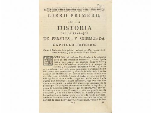 1768. LIBRO. (CERVANTINA). HISTORIA DE LOS TRABAJOS DE PERSILES, Y SIGISMUNDA. Barcelona: Imp. Juan Nadal, 1768. 8º mayor. 2 h.+ 352 p.+ 2 h. Sin la portada. Ilustr. con capitales, viñetas y culs-de-lampe xilografiadas. Última p. laminada, tenue cerco de humedad en algunas p. Enc. en pergamino moderno, lomera rotulada. Palau 53908.