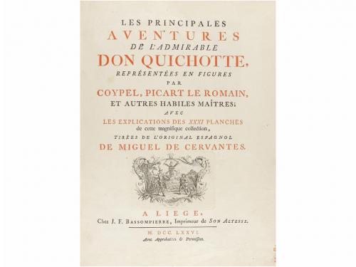 1776. LIBRO. (CERVANTINA). LES PRINCIPALES AVENTURES DE L'ADMIRABLE DON QUICHOTTE, REPRÉSENTÉES EN FIGURES PAR COYPEL, PICART LE ROMAIN, ET AUTRES HABILES MAITRES; AVEC LES EXPLICATIONS DES XXXI PLANCHES DE CETTE MAGNIFIQUE COL. A Liége: J. F. Bassompierre, 1776. Folio. VIII + 356 p.+ 29 lám. (de 31, sin la lám XIX y XXII). Ilustr. con dos viñetas grabadas en portada y al inicio de la obra. Plena piel de época, nervios, tejuelo, lomera cuajada, hilos dorados en los planos, cantos cejas, cortes pintados. Cajo rozado. Impresión limpia y con amplios márgenes. Reedición de la Haya de 1746, de esta interpretación del Quijote por los más famosos dibujantes y grabadores franceses de la época, como Coypel, Tresmolier, Le Bas, Cochin fils y Boucher y grabados por Schley, Picart, Tanje y Fokke. Palau 52753. Martín del Río 331. Exlibris de Jean de Bry, que fue presidente de la Convención Nacional en 1793 y votó a favor de la condena y ejecución de Luis XVI, vivió en el exilio hasta la restauración en 1816.
