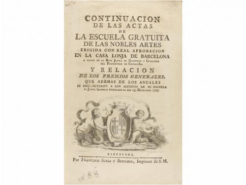 1797. LIBRO. (BARCELONA). CONTINUACION DE LAS ACTAS DE LA ESCUELA GRATUITA DE LAS NOBLES ARTES ERIGIDA CON REAL APROBACION EN LA CASA LONJA DE BARCELONA...y relación de los premios generales... en Junta General Celebrada el di. Barcelona: Francisco Suria y Burgada, 1797. 4º menor. LXV p. Grabado de Montaña en la portada con el escudo de la ciudad y viñeta, ambos calcográficos. Enc. en cartoné en papel pintado, cortes dorados.