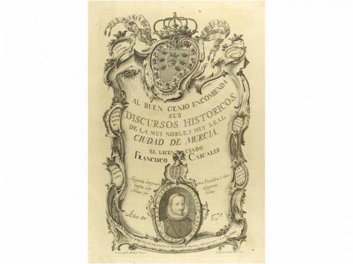 1775. LIBRO. (MURCIA). DISCURSOS HISTORICOS DE LA MUY NOBLE Y MUY LEAL CIUDAD DE MURCIA. Murcia: Francisco Benedito, 1775. Folio. 8 h. + 556 p., 6 h. Texto a dos columnas ilustr. con 17 lám. de escudos heráldicos de familias murcianas, grabadas por Martin y Lariz. Portada grabada al cobre por Fernando Martín. Enc. restaurada en plena piel, hilos dorados en ambos planos. Palau 47159 cita un mapa que este ejemplar no posee. "Bien que la primera edición es codiciada por los bibliófilos, esta segunda tiene más estima entre los estudiosos por haberse añadido noticias de familias nobles establecidas en Murcia después de la muerte del autor; el complemento del catálogo de los obispos de Cartagena y Murcia hasta 1775; descripción de monumentos construídos después de 1621 y declaraciones de los colores que deben llevar los escudos según las reglas del balsón" .