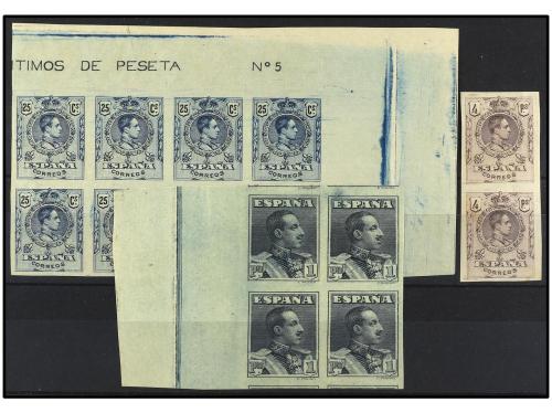 ** ESPAÑA. Ed. 310/23 sin 320. SERIE COMPLETA a falta del 50 cts. 13 valores en bloques de cuatro. 4 y 10 pts. ceros. Mayoría centrados de LUJO. Cat. +2.800€.