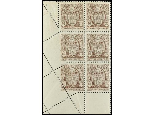 ** ESPAÑA. Ed. 975 (6). 40 cts. castaño. Bloque de 6, 3 sellos SIN DENTADO PARCIAL debido a pliegue del papel. RARO y de LUJO.
