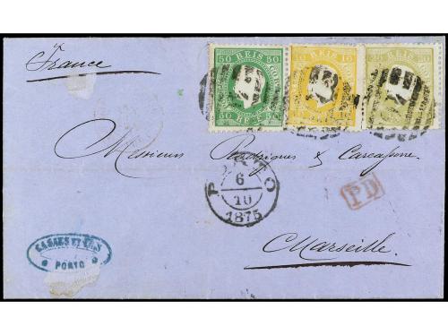 ✉ PORTUGAL: MADEIRA. Mu. 17. 1877. Sobre procedente de Brasil sin franqueo y circulada por el correo inglés vía Liverpool a Madeira vía Lisboa y allí redirigida otra vez a Lisboa con franqueo de tres sellos de 25 reis habilitados MADEIRA. La carta fue tasada con 300 reis que una vez fueron pagados se anularon para no ser cobrados otra vez al ser redirigida a Lisboa, algunos defectos. Muy interesante combinación.