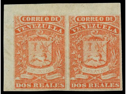 * VENEZUELA. Sc. 3 (2). 1859. 2 reales rojo. Pareja, preciosa.