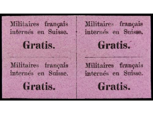 **/* SUIZA. Yv. 1. 1870. FRANQUICIA MILITAR. Sin valor negro s. lila. Bloque de cuatro, dos sellos sin fijasellos. Cat. +600€.