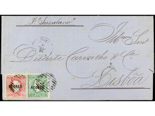 ✉ PORTUGAL: AZORES. Mu. 4, 19. 1868. HORTA a LISBOA. 25 reis rosa, dent. y 50 reis sin dentar, mat. círculo de líneas con número 15 en el interior. Rara combinación de franqueo dentado y sin dentar.