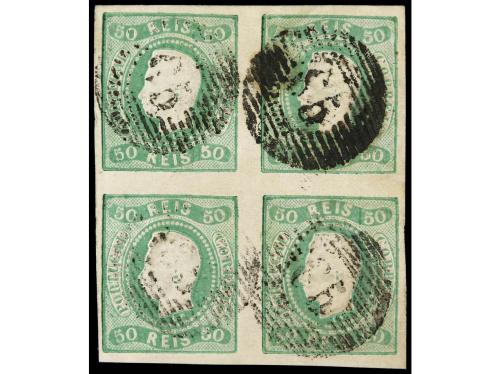 ° PORTUGAL. Mu. 23. 50 reis verde, bloque de cuatro, mat. círculo de puntos con cifra "65" de Mondim de Basto. BONITO. Cat. 960€.