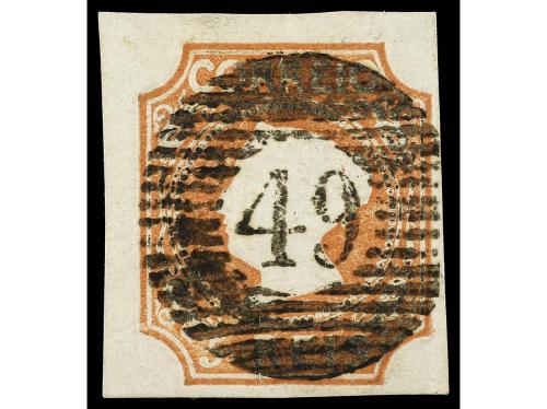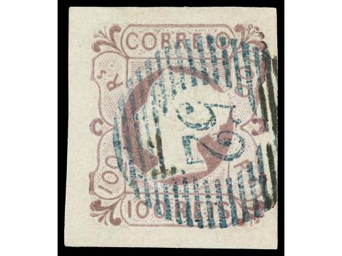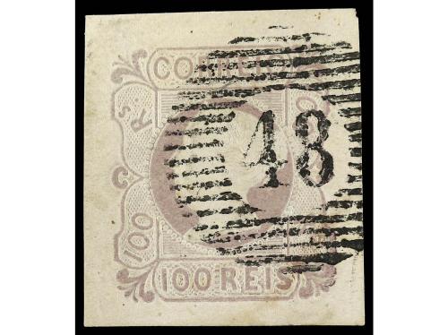 ° PORTUGAL. Mu. 4. 100 reis lila, mat. círculo de barras con cifra "48" de Angra de Heroismo. MAGNÍFICO. Cert. HOLCOMBE y FERCHEBAUER. Cat. 5.500€.