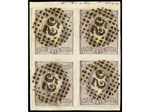 Δ PORTUGAL. Mu. 25. 100 reis lila. Bloque de cuatro sobre pequeño fragmento, mat. círculo de puntos "52" de PORTO, corte de tijeras, entre los sellos sin importancia. Cat. 1.440€.