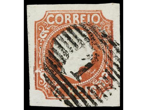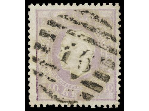 ° PORTUGAL. Mu. 4. 100 reis lila, mat. círculo de barras con "52" en azul de Porto. MAGNÍFICO. Cert. FERCHENBAUER. Cat. 3.500€.