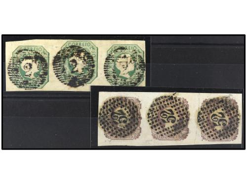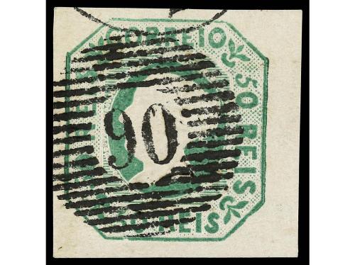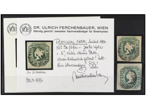 ° PORTUGAL. Mu. 3. 50 reis verde. Dos sellos de excelente presencia, uno con mínimos defectos y el otro reparado. Cat. 3.600€.