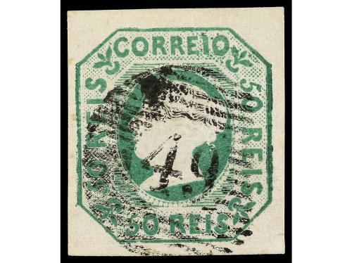 ° PORTUGAL. 50 reis verde, mat. círculo de barras con cifra "49" de Horta. Mínimo adelgazamiento. Excelente presencia. Cert. FERCHENBAUER. Cat. 1.800€.