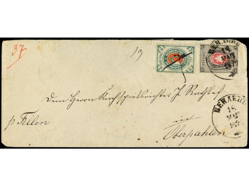 ✉ RUSIA. 1873. Carta circulada con sello de 7 ko. gris y rojo y sello local de WENDEN de 2 ko. verde y rojo cancelado a pluma.
