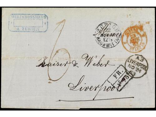 ✉ SUIZA. 1863. ZURICH a LIVERPOOL. Marca de intercambio Franco -Británica FR/1F 78c.