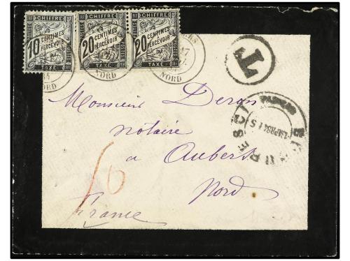 ✉ RUMANIA. 1884. BUCAREST a FRANCIA circulada sin sellos y tasada a la llegada con sellos franceses de 10 cts. negro y 20 cts. negro (2). RARA.