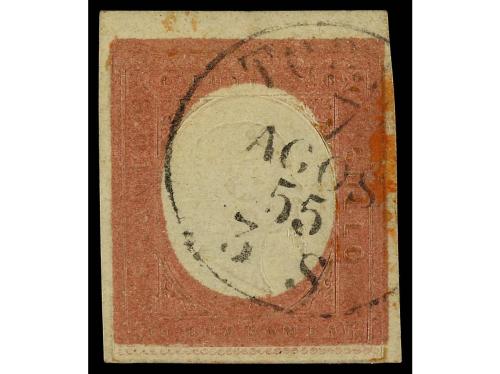° ITALIA ANTIGUOS ESTADOS: CERDEÑA. Yv. 9. 1854. 40 cts. rojo. Mat. fechador de TORINO. Muy bonito. Cert. RAYBAUDI.
